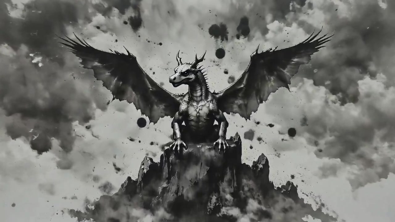 Dolly in camera movement: The camera pushes forward toward an ancient dragon coiled atop a jagged mountain peak, its massive wings unfurling as it roars, releasing a burst of swirling black ink that stains the sky. Lightning crackles behind it, illuminating ink-wash clouds and sweeping calligraphic strokes. Stylized sumi-e animation with bold brushwork, monochrome palette with crimson accents, evoking epic myth and traditional Japanese ink art.