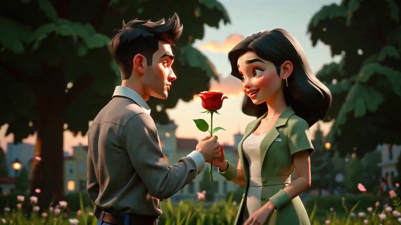 Handheld camera movement: A stylized 3D toon man offers a rose to his love in a cozy park at sunset, the camera swaying gently as she smiles and reaches out. Petals drift through the warm air, capturing the tender moment. Vibrant colors, soft lighting, and expressive animation create a romantic, heartfelt atmosphere.