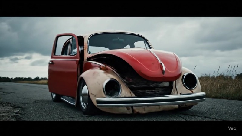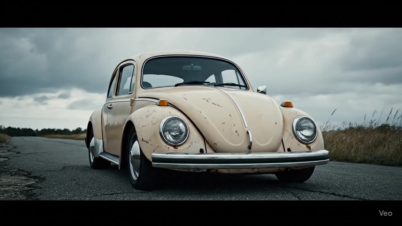 A weathered, classic VW Beetle sits alone under a moody sky. Slowly, its curves begin to shift and stretch—the humble rounded body elongates, the headlights sharpen, the stance lowers. Panels ripple like liquid metal as chrome details morph into sleek, aerodynamic lines. The transformation completes in a dramatic burst of motion, revealing a stunning red Porsche 911 gleaming under cinematic lighting. Ultra realistic, every reflection and shadow captured in detail, emphasizing the powerful contrast between the old Beetle and the reborn sports car.