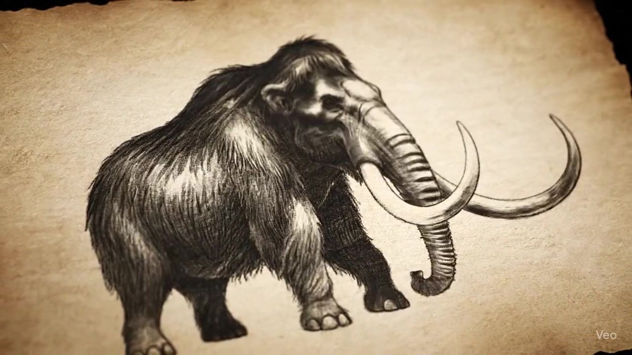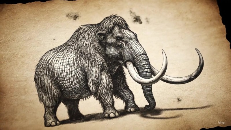 "A rough pencil sketch of a massive woolly mammoth on old parchment. The lines animate as if being drawn by hand. Slowly, shading fills in with rough charcoal strokes. Next, the sketch gains depth—pencil lines transform into a 3D wireframe of the mammoth, then textures of thick fur and tusks emerge. Colors bleed in like earthy watercolors—browns, greys, and ivory. Finally, it snaps into a hyper-real cinematic shot of the mammoth stomping through a snowy Ice Age landscape, its breath steaming in the frozen air as snow swirls around.",