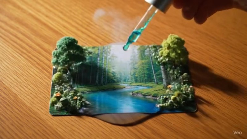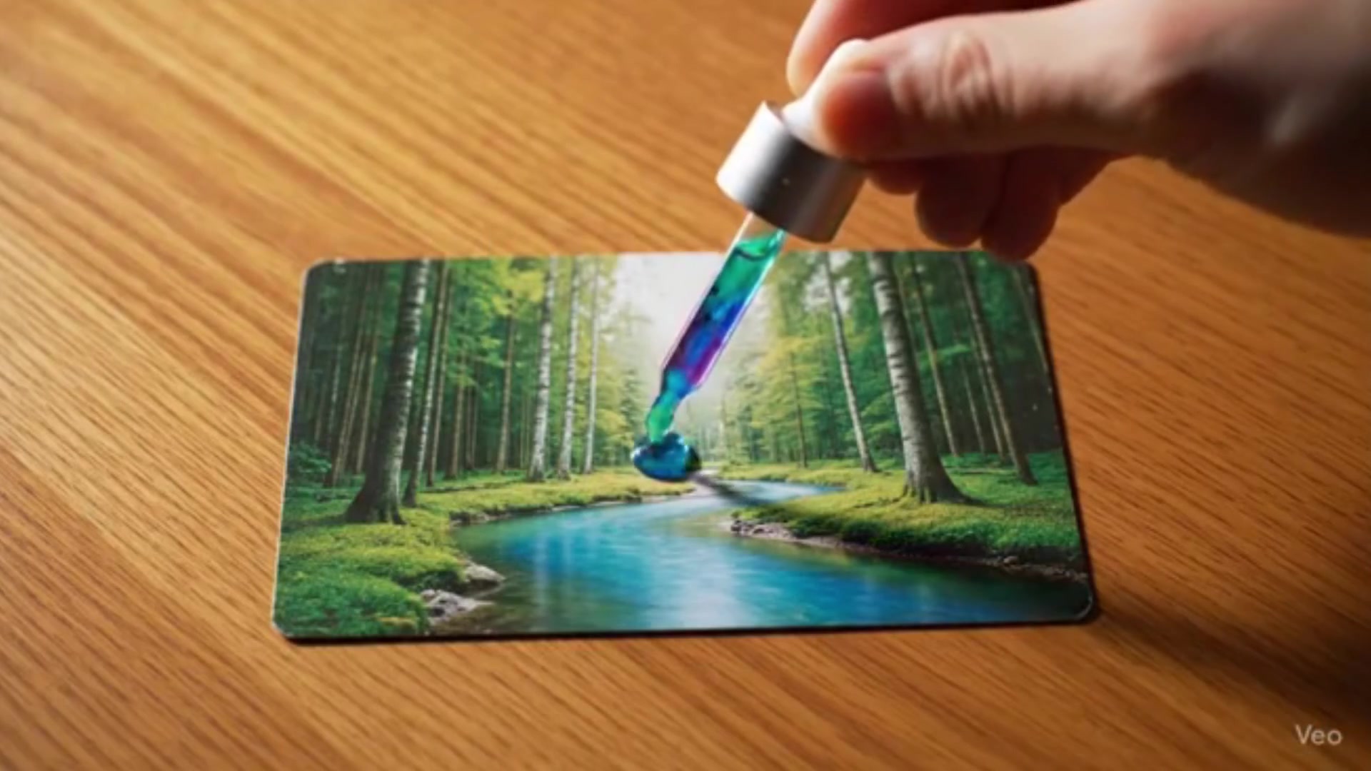 A surreal, cinematic close-up: A postcard lies flat on a wooden table, captured in ultra-clear 8K resolution, with steady, continuous camera movement and no jerks. A hand slowly appears from above, holding a crystal dropper, and drips a drop of magically colored paint onto the center of the postcard. As the paint spreads, a faint shimmer appears, and the paper expands like a vast river, gradually revealing miniature elements such as trees, flowers, stars, buildings, and the ocean, creating a vibrant, dreamlike, three-dimensional microcosm. HDR cinematic lighting blends soft natural light with dreamy tones, creating a smooth, natural, and soothing atmosphere. ASMR sound effects include crisp, gentle "clicks," the dripping of paint, a subtle hissing sound, and ambient sounds such as rustling leaves, the folding of petals, the rise of bubbles, and the buzzing of insects. The seamless, all-in-one shot, with ultra-realistic 8K detail, delivers an immersive, magical experience.
