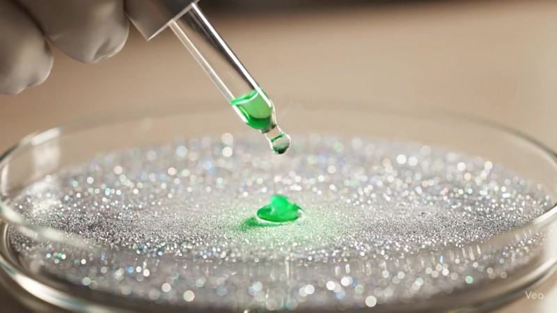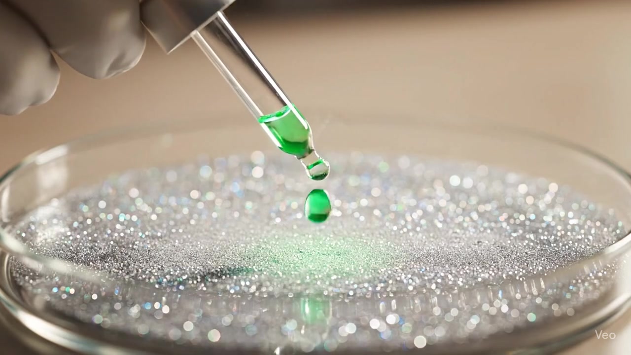 "ASMR macro shot: A gloved hand gently holds a glass dropper above a circular petri dish filled with shimmering silver dust. With precision, it releases a single glowing emerald-green droplet — just once. As it lands, cinematic ripples bloom outward, and a voxel-style Statue of Liberty rises in luminous patina-green detail, its golden torch glowing softly. Around it, pixel ferries glide across shimmering water, cube-shaped skyscrapers tower nearby, voxel bridges span the horizon, and fluttering voxel seagulls appear. Soft metallic clicks, distant digital waves, and satisfying ripple pops complete the dreamy ambiance."