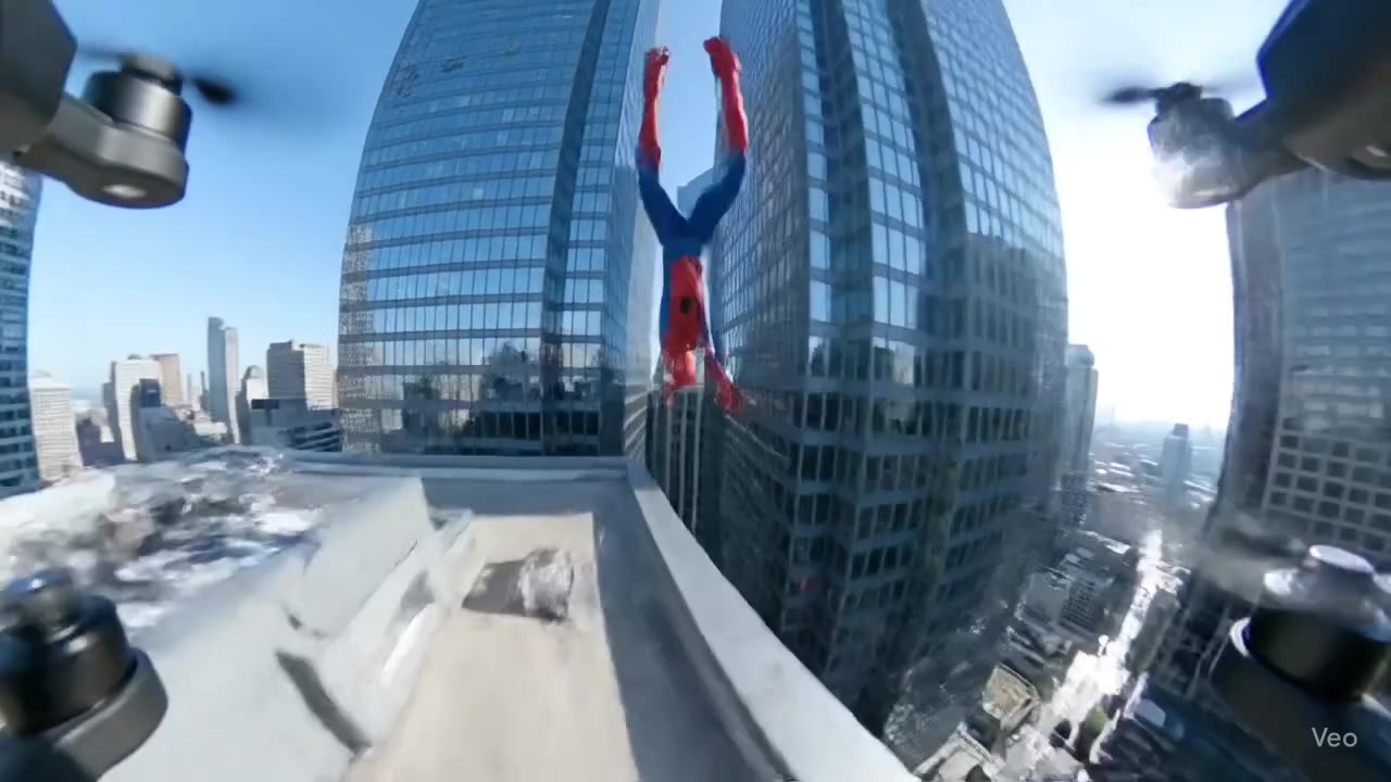 First-person FPV drone footage of Spider-Man performing extreme rooftop parkour in a modern city. The drone chases tightly behind Spider-Man as he sprints, leaps across huge rooftop gaps, and does mid-air flips. During each jump, the drone dives and wobbles slightly with turbulence, keeping Spider-Man centered. Spider-Man shoots webs mid-air, swings across skyscrapers, runs along walls, and performs rapid stunts like flips and twists.<br />The FPV drone tilts, rolls, and accelerates to stay on him, creating a raw, adrenaline-fueled chase. Final shot: the drone pulls up as Spider-Man lands on a tall building ledge in superhero pose, revealing the skyline from above. Ultra-realistic, high-speed FPV drone style with no cinematic cuts.