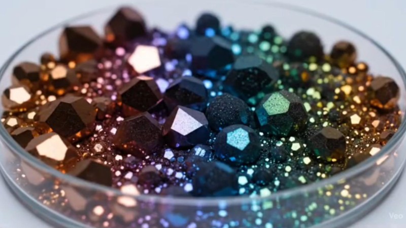 "action": "A gloved hand holds a silver tweezer with a 'flat copper ore flake' in it and carefully puts it into a round petri dish filled with 'crystal powder shining with a colorful halo'",