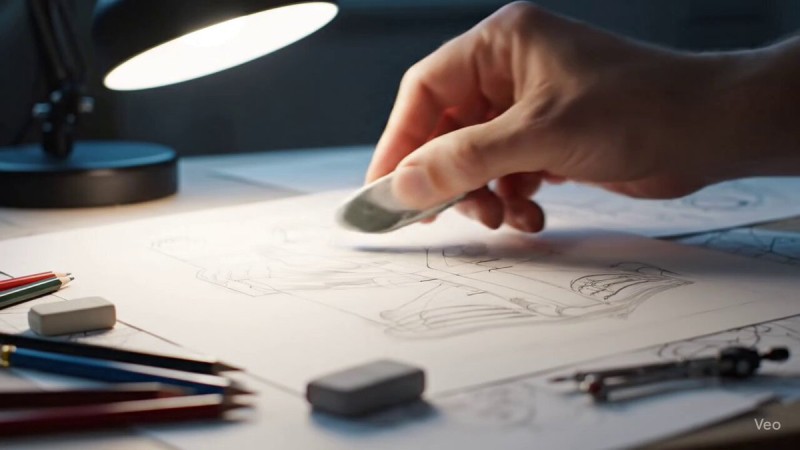 "A hyper-realistic sequence showing a photorealistic Formula 1 car emerging from a detailed pencil sketch on a cluttered architect's desk.", "camera": { "type": "Slow Arc Shot", "lens": "100mm Macro Prime", "aperture": "f/2.8", "position": "Starts as an extreme close-up on the pencil drawing, then slowly pulls back and arcs around the car as it transitions to a 3D object.", "environment": { "location": "A designer's or engineer's drafting table.", "details": "The surface is a sheet of high-quality, slightly textured white paper covered in technical blueprints and schematics of the car. Several graphite and colored pencils, an eraser, and a compass are scattered around the main drawing. The background is a dark, out-of-focus workshop." }, "lighting": { "primary_source": { "type": "Architect's Desk Lamp", "position": "Just out of frame, to the top left.", "fill_light": { "type": "Soft Ambient Light", "source": "From the out-of-focus workshop background.", "color": "Cool, bluish tint.", "intensity": "Low, to gently lift the darkest shadows and add depth to the scene." } }, "main_subject": { "name": "The Formula 1 Car", "initial_state": "A masterful, hyper-realistic pencil drawing. The lines are precise, the shading is smooth, and there's a sense of depth even in 2D.", "final_state": "A fully realized, photorealistic 3D model of the Red Bull F1 car. The materials are perfect: glossy carbon fiber, metallic paint with livery, and soft-sheen rubber tires.", "animation": { "0.0s - 2.0s": "The camera is focused on the drawing. A photorealistic hand enters the frame with an eraser and gently removes a few faint construction lines from the sketch.", "2.0s - 7.0s": "A magical 'wave' of transformation begins at the front wing of the car and sweeps backward. As it passes, the 2D pencil lines and shading seamlessly transform into 3D, textured materials. The drawn debris on the track lifts up and becomes real, floating for a moment before settling.", "7.0s - 8.0s": "The transformation is complete. The car is now fully 3D, sitting on the paper as if it's a real, miniature vehicle. The engine subtly whirs to life, and the exhaust vents emit a tiny, realistic heat haze." } }, "audio_design": { "style": "Transformative, from quiet and organic to powerful and cinematic.", "timeline": [ { "time": "0.0s - 2.0s", "sound": "The soft, realistic sound of a pencil's graphite scratching on paper, and the gentle 'shhh' of an eraser." }, { "time": "2.0s - 7.0s", "sound": "A low, magical humming and shimmering sound that grows in intensity and pitch as the transformation wave moves across the car. This is layered with an epic, swelling orchestral score." }, { "time": "7.0s - 8.0s", "sound": "The orchestral score reaches a crescendo. A final, satisfying 'click' as the transformation completes, followed by the low, powerful hum and subtle electronic whir of the F1 car's idling engine." } ] },