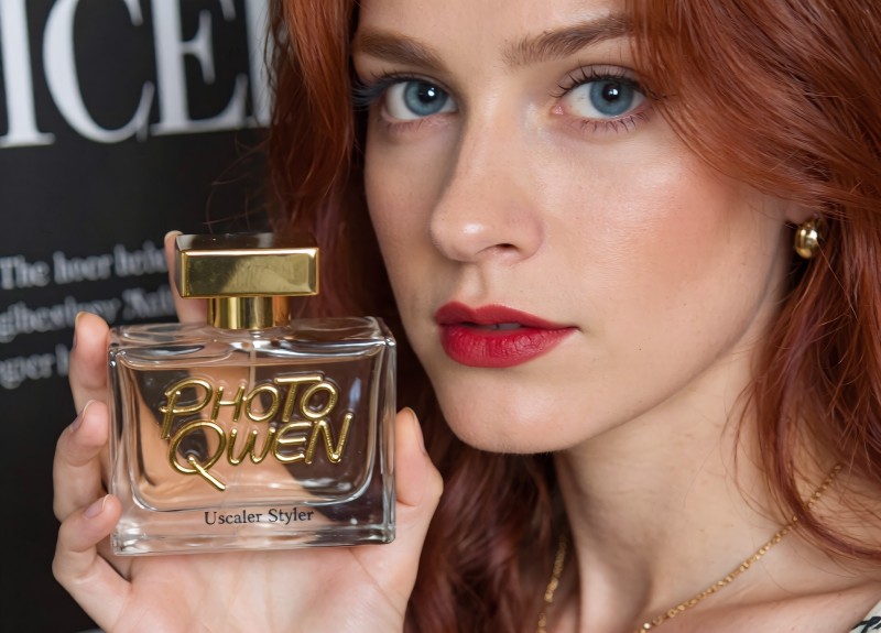 The perfume bottle, held in her hand, is clear with a gold cap. The label on the bottle reads "PHOTO QWEN" in a large stylish, 3d, golden, cursive font, and "Uscaler Styler," in a smaller serif font  . The background is partially visible, showing a black surface with white text, adding depth to the image. The lighting is soft and flattering, highlighting her features and the details of the perfume bottle.