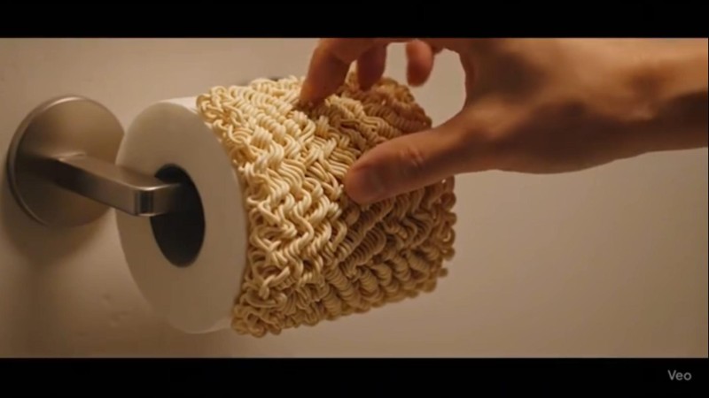 An ultra-photorealistic, 8K cinematic montage video, presented as a "Which one would you choose?" scenario. Each scene features a toilet paper roll on a simple holder, but reimagined with a different, impossible, and surreal material. The visuals are enhanced with hyper-realistic textures and satisfying ASMR sound design. The sequence of surreal toilet papers includes: Water: A roll where the paper is a sheet of perfectly clear, flowing water. A hand pulls it, and it stretches and drips like a viscous liquid under cool, moody blue lighting. Ramen: A perfect, solid block of dry, uncooked ramen noodles, expertly shaped into a toilet paper roll. A hand pulls on a single strand, and a long, continuous noodle unravels from the block with a satisfyingly crisp sound.