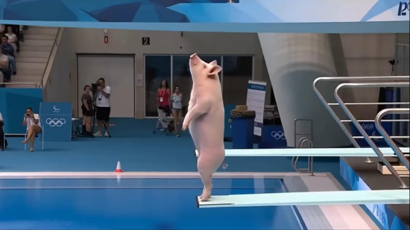 A photorealistic, hyperrealistic 8K video, captured in the style of a dramatic Olympic sports broadcast. The scene is a massive indoor natatorium with a cheering crowd. The camera focuses on the very top of a 10-meter high dive platform, where a large, athletic domestic pig is standing upright on its hind legs. The pig, looking like a focused professional diver, stares down at the pool below. It then performs several short, powerful preparatory bounces on the edge of the concrete platform, gathering its strength and momentum. With a final, explosive push, it launches itself high and outwards, away from the platform. The video switches to slow-motion as the pig travels a significant distance through the air in a majestic, high arc. It executes a complex acrobatic maneuver, perhaps a double somersault with a twist. The camera follows its entire flight path, emphasizing the pig’s hang-time and the surreal sight of a pig flying gracefully. Finally, it straightens its body and cuts cleanly into the blue water with a perfect, minimal splash entry. The overall tone is epic, humorous, and jaw-dropping surreal, with a seamless integration of CGI into a realistic live-action environment.