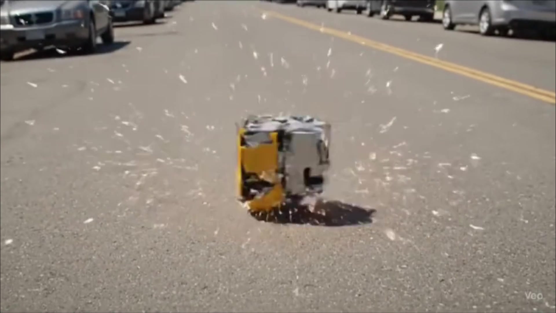 POV wide-angle handheld view in daylight: Amas's hand is seen holding a small metallic cube while walking on a quiet street. The hand throws the cube forward onto the road. The cube stays the same size as it spins and lands.