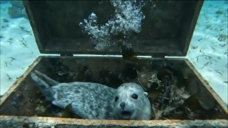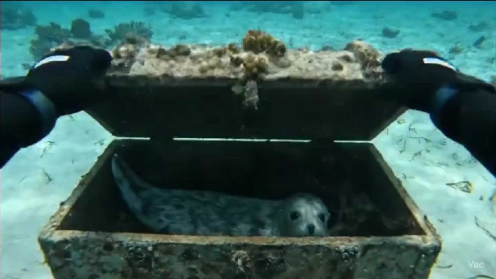 A surreal but natural underwater moment: a scuba diver discovers a baby seal pup inside a treasure chest. As the pup notices the diver, it playfully swims upward and licks the camera lens, creating a tender, immersive connection between animal and viewer.