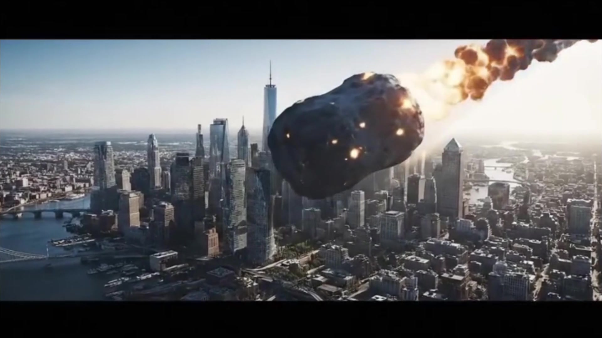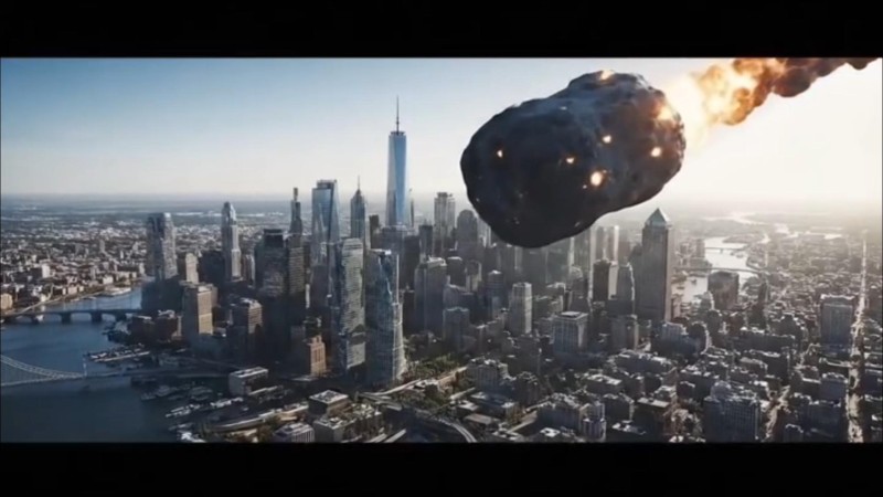 Ultra-realistic 8K slow-motion aerial of a sprawling modern city hit by a massive glowing asteroid. Skyscrapers shatter, glass, steel, and concrete suspended mid-air. Rolling shockwave bends structures, fireball and molten debris rain down. Warm firelight contrasts cold steel gray. Dust, smoke, sparks swirl naturally. Low rumble builds to deep impact thump, glass shatters, fires crackle. No people, vehicles, captions. -ar 9:16