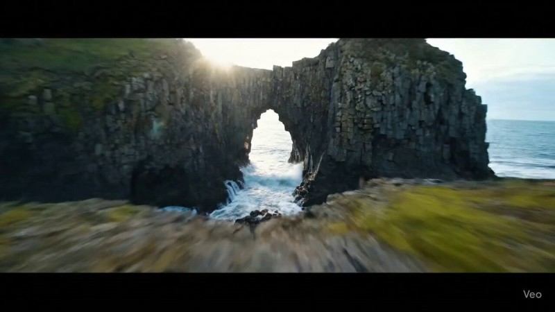 Sweeping aerial vista: the camera glides inches above jagged headlands, shadow and spray racing in sync with the surf. It plunges without warning through a stone sea arch, spinning into a helical dive that mirrors the rhythm of the tide. Foam explodes against basalt spires, kelp ribbons streak past in layered parallax. Suddenly, a rogue wave towers—lens whirls up its glassy wall in a corkscrew climb, sunlight burning golden filigree across the crest. Horizon spins, disoriented yet mesmerizing, but never reveals the source of flight. The journey ends with a soaring oblique S-curve, bursting out into open expanse: ocean plunging to abyssal depths, a rainbow fractured in mist, gulls slicing the sky—scale unchained, vast and intimate at once.