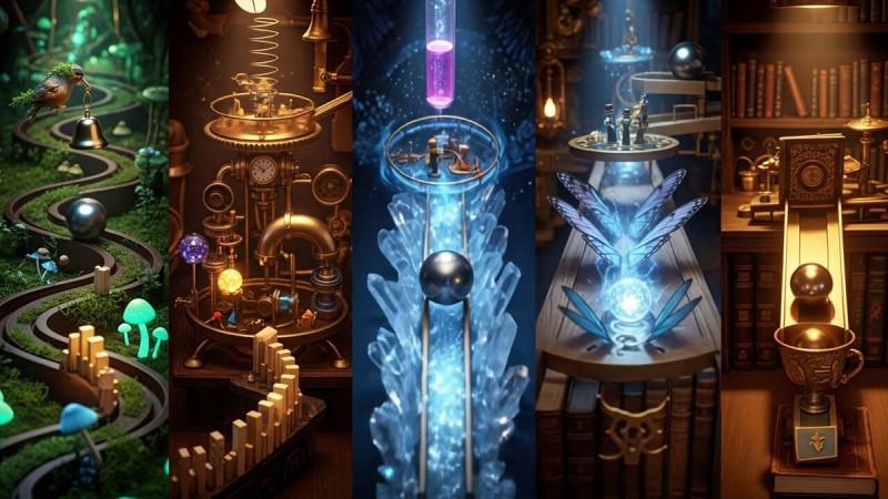 ```A split-screen composition of five vertical panels, all shown simultaneously for the full sequence. Each panel is a continuous close tracking shot, as if a camera is fixed just behind a polished metal ball while it travels through a fantastical Rube Goldberg maze. Each panel shows its own ball on its own roller-coaster-like path of ramps, spirals, loops, and levers. The motion lasts from start to finish, with each ball completing its journey in that panel. All five panels remain active together. Panel 1: a glowing forest maze of mossy ramps and mushroom platforms, ending as the ball rides into a luminous tree hollow. Panel 2: a brass clockwork maze of gears, pendulums, and pipes, ending as the ball spins into a rotating gear cup. Panel 3: a crystalline maze of sparkling arches and mirrored ramps, ending as the ball drops into a radiant crystal bowl. Panel 4: a mechanical garden maze with butterfly wings and flower levers, ending as the ball lands on a glowing pedestal. Panel 5: a scholarly maze built of books, parchment ramps, and ink-bottle levers, ending as the ball rolls into a golden chalice. Camera: very close POV tracking directly behind each ball, smooth continuous motion, eye-level with the track, cinematic realism. Style: imaginative, hyper-realistic fantasy, unified color grading, magical realism. ```