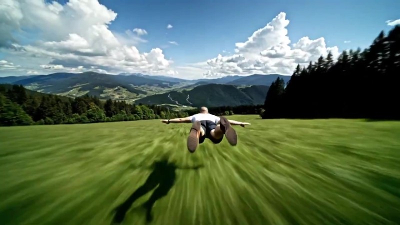 An ultra-low angle, wide, mid-close-up tracking shot. The camera glides smoothly and rapidly just inches above lush green grass, creating a strong sense of speed and perspective depth with dynamic motion blur. Dominating the frame is the back of a real bald man (wearing a white t-shirt, dark shorts, and brown shoes). His body is stretched out horizontally, parallel to the ground, as if he is superman-flying or suspended in the air. He is gliding low and smoothly forward, casting a clear, sharp shadow on the grass directly below him. The background is a vast, beautiful valley with dense grass and a dark green forest. In the far distance, rolling mountains with a visible winding path stretch across the horizon. The sky above is a vibrant blue, filled with large, fluffy white clouds. The overall image is hyper-realistic and captures a sense of exhilarating, dream-like motion.