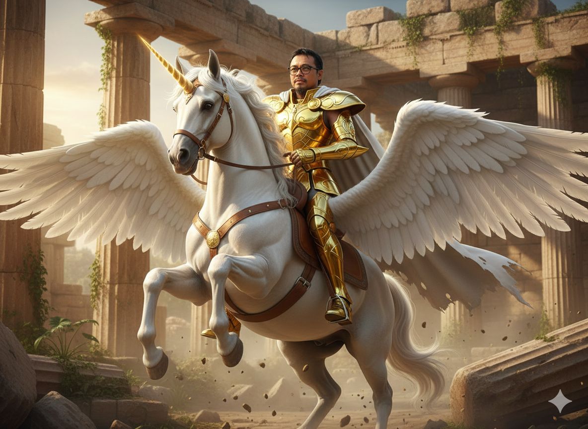 He is mounted on a magnificent **white Pegasus (winged horse)**. The Pegasus is depicted in a **powerful rearing (berjingkrak) pose**, standing on its hind legs. Its body is muscular and perfectly formed, with **immaculately detailed, huge white feathers** on its wings. **The Pegasus is fitted with a tan leather saddle and a detailed gold bridle (tali kekang emas).** The horse has a **single, spiraled, glowing gold unicorn horn** on its forehead. **Both the horse's body and its gold horn are softly glowing.**