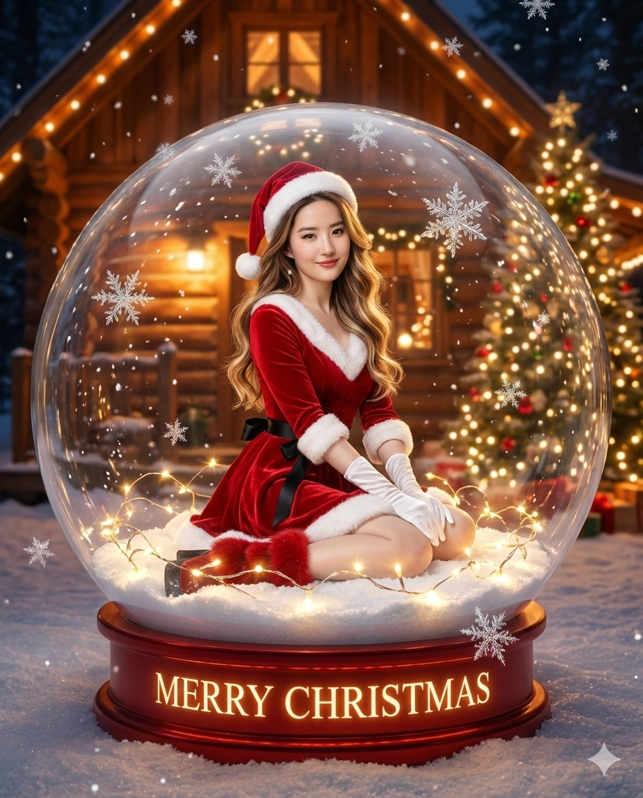 Create a realistic, cinematic 8K magical and festive portrait of a beautiful woman wearing a short red velvet Santa dress with white fur trim, a black ribbon, a red Santa hat, white gloves, and boots with red fur accents. She is sitting comfortably on a realistic snow bed inside a large, clear glass snow globe, surrounded by warm, twinkling string lights. The base of the snow globe is red and glows with illuminated text that reads "MERRY CHRISTMAS." The snow globe is placed outdoors, reflecting the highly realistic and warm lighting style of the provided reference image, in a snowy, softly lit winter night scene, in front of a cozy wooden cabin adorned with festive Christmas lights and a decorated Christmas tree to the side. The scene features only a small amount of falling snow, but with very realistic, classic six-sided dendritic snowflakes, clearly visible in their intricate natural forms. These realistic snowflakes are clearly seen floating in the air outside the globe and visibly resting and landing on top of the glass snow globe surface, as well as on the snowy ground. The overall lighting is warm, inviting, and highly atmospheric, creating a magical and enchanting Christmas atmosphere with a soft, hyper-detailed bokeh background.