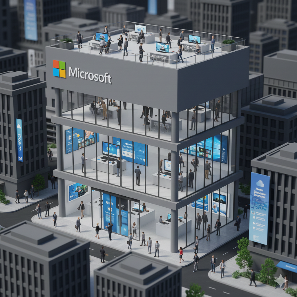 3D rendering, miniature architectural photography style, main structure is a colossal Microsoft Surface product box building, featuring sleek gray rectangular box with four-colored window logo and "Microsoft Surface" text. Two-story building design: ground floor has glass entrance doors at box front, modern promotional display area, and productivity zones with professionals using Surface devices inside. Interior shows abundant Windows displays, Xbox gaming sections and Azure cloud technology exhibits. Second floor includes transparent windows and rooftop innovation center with people collaborating on Teams and Office apps. Surrounding urban environment shows corporate tech spaces, business professionals walking with Surface laptops, and digital transformation displays. Professional and empowering atmosphere emphasizing productivity and innovation, showcasing Microsoft's brand identity in enterprise technology sector. High-quality 3D rendering, detailed miniature style, vibrant commercial photography aesthetic