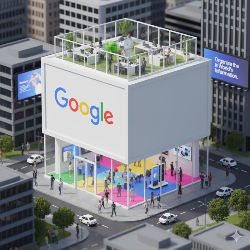 3D rendering, miniature architectural photography style, main structure is a colossal Google branded server/data center equipment box building, featuring white rectangular shipping box with colorful "Google" logo in signature colors (blue, red, yellow, green). Two-story building design: ground floor has glass entrance doors at box front, multicolored promotional display area, and tech innovation lab with people testing Pixel phones inside. Interior shows abundant Google product displays, Android demo stations and AI assistant interactions. Second floor includes transparent windows and rooftop creative workspace with people using Chromebooks and collaborating. Surrounding urban environment shows Silicon Valley aesthetic, tech workers walking with coffee, and self-driving Waymo cars. Innovative and playful atmosphere emphasizing organizing world's information, showcasing Google's brand identity in technology services sector. High-quality 3D rendering, detailed miniature style, vibrant commercial photography aesthetic