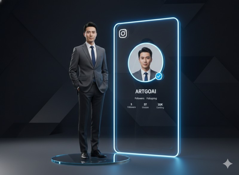 A high-quality 3D render of a character [based on Reference Image] standing casually on a minimalist clear round pedestal. To the right stands a tall, floor-length transparent acrylic glass panel with glowing neon edges. The panel displays a sharp, holographic Instagram profile interface: the Instagram logo in the top-left, a large circular profile photo with a blue verified checkmark, and the text ID "ARTGOAI" clearly written below. The scene is set against a dark background with soft bluish-white studio lighting, creating a futuristic, tech-inspired aesthetic. Octane render, 8k resolution, clean composition.
