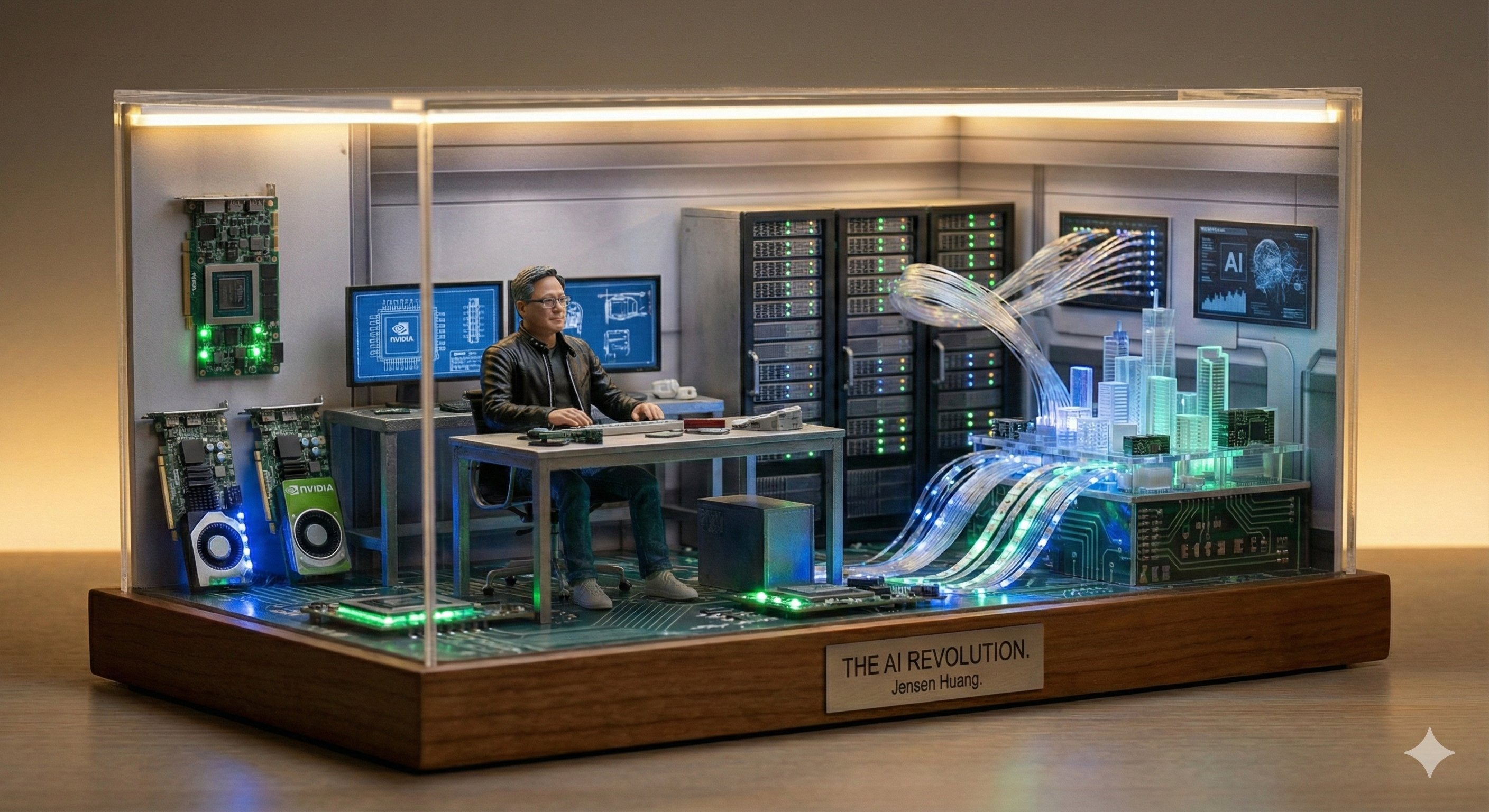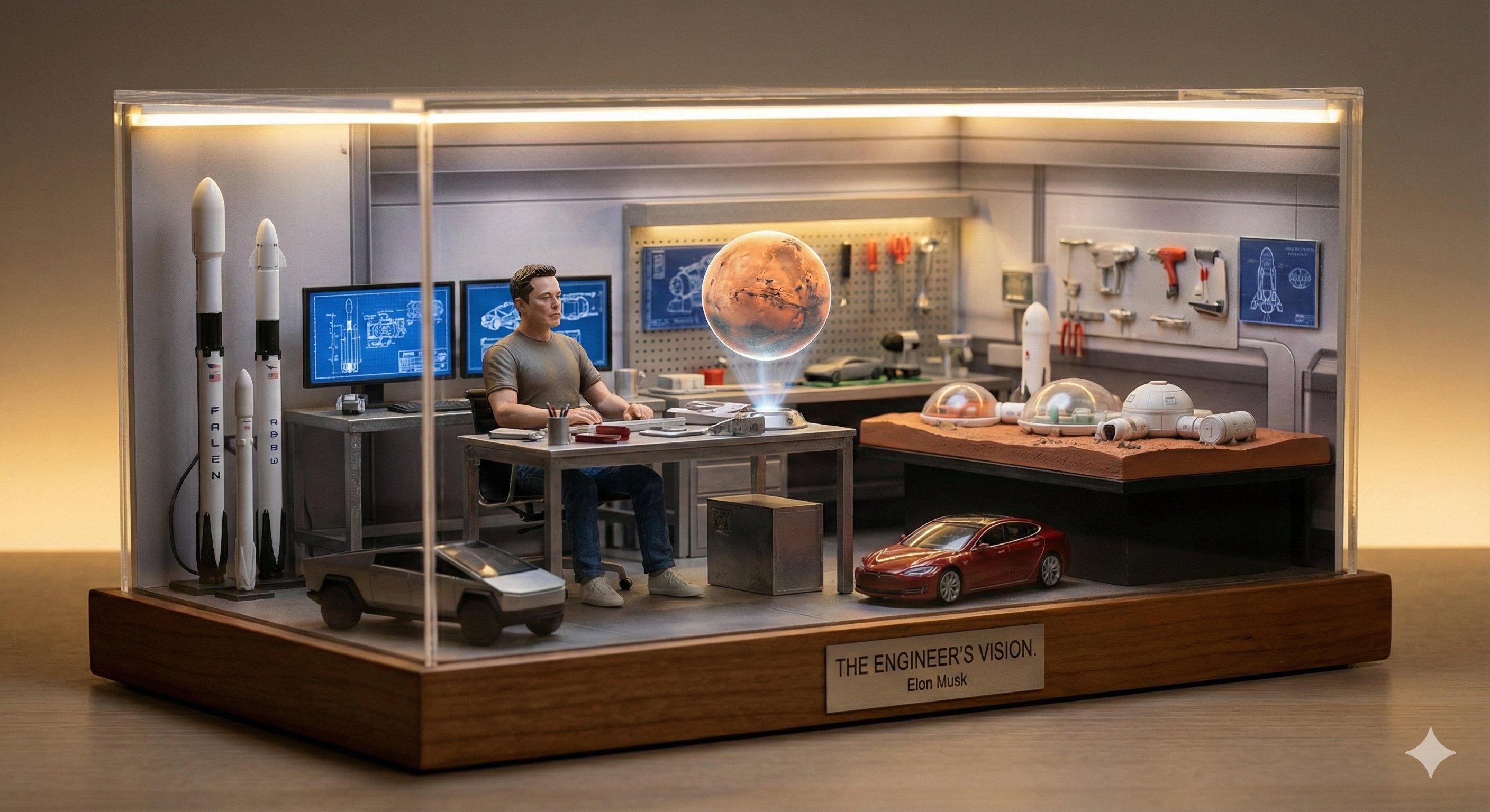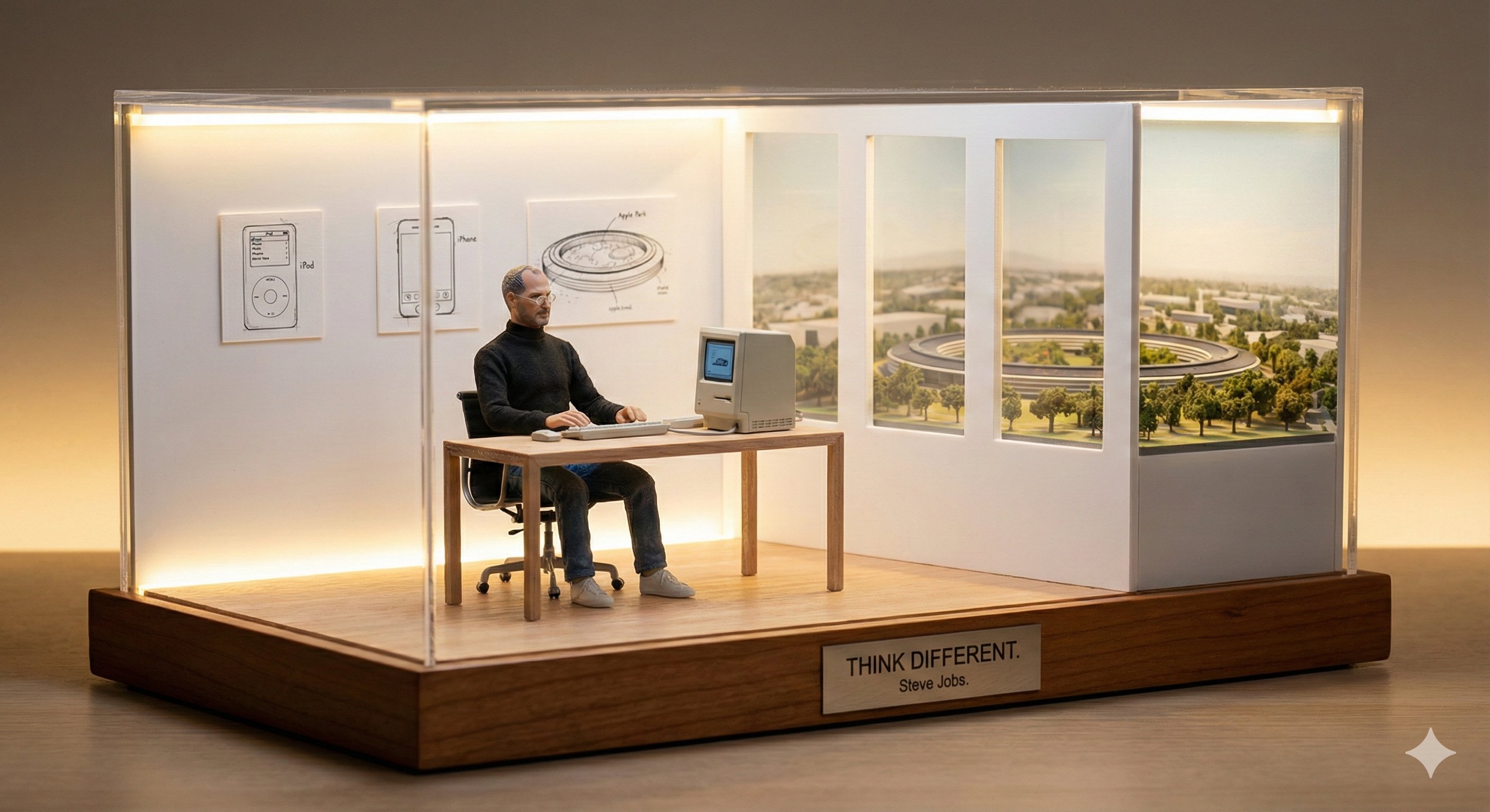 A miniature diorama of [BUSINESS LEADER Bill Gates, Jensen Huang Steve Jobs, Elon Musk] inside a symbolic workspace representing their vision. Tiny desk, screens, city models, warm ambient lighting