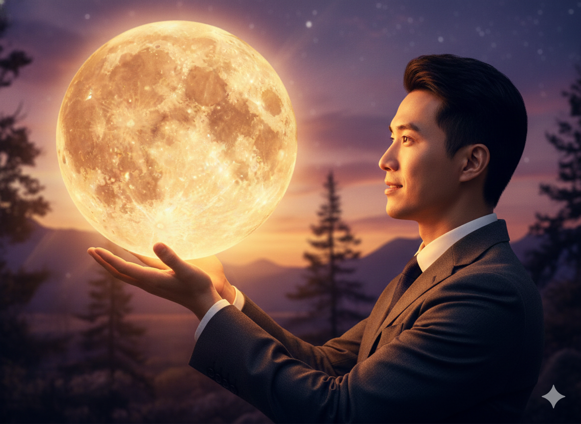 If no reference image is provided, ask for one. Cinematic photorealistic portrait, vertical composition, saturated and vivid colors. A man (use the provided image for accurate facial features) stands outdoors at sunset, waist up, in the right third of the frame, in profile facing left. He holds a giant, bright full moon in both hands, palms supporting its lower part, fingers spread. The moon is large, occupying the upper left quadrant, glowing intensely in a golden orange