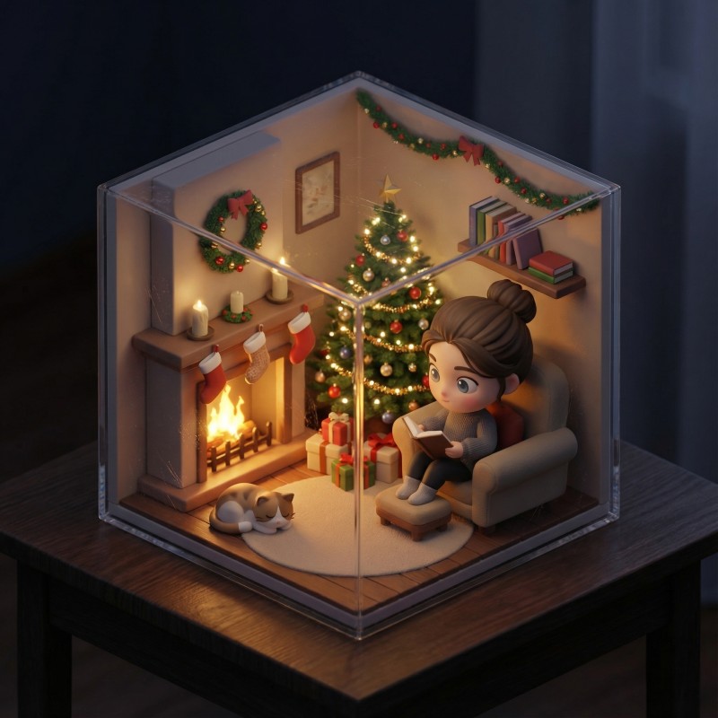 A [subject] is [doing something] in a [place]. Isometric 3D cube diorama with internal lighting, cute chibi figurine style, matte PVC material, big head/small body. Neutral background on a table in a dark room. Enclosed in a cube. Fill the diorama with many cute little details. Add delicate imperfections like dust, scratches and textures to make it real.