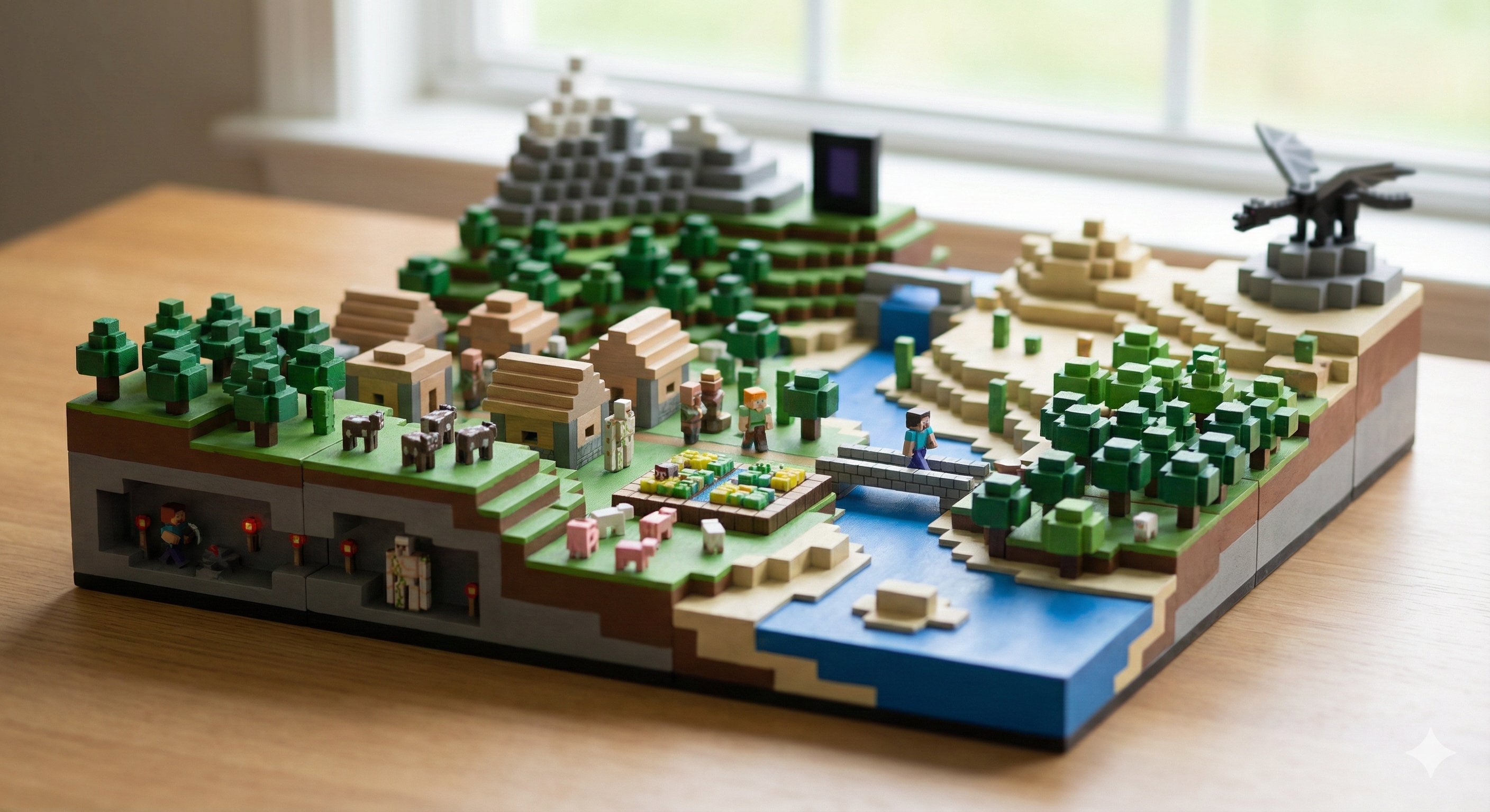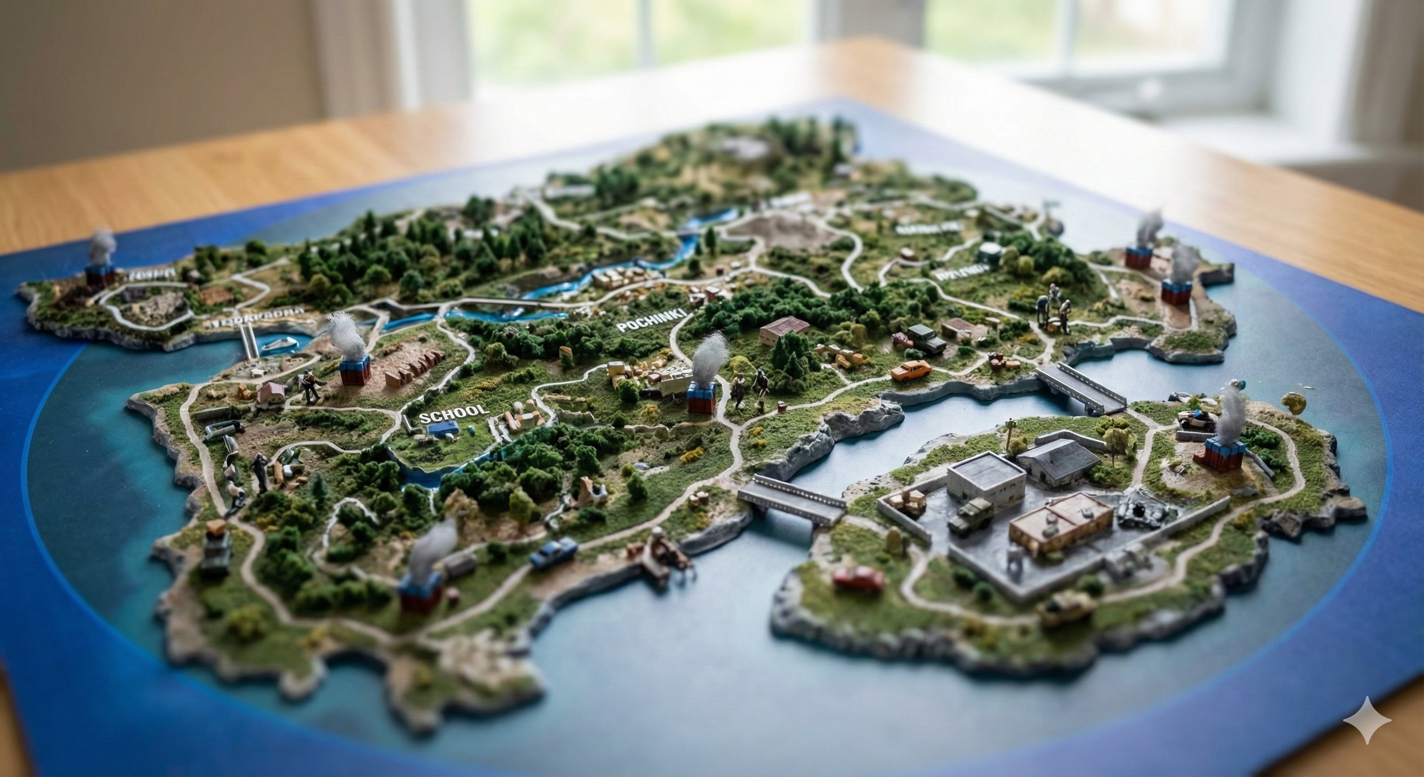 A miniature tabletop version of the iconic map from [VIDEO GAME 1PUBG Mobile (Erangle Map) 2GTA V (Los Santos) 3Minecraft (Overworld) 4Cyberpunk 277 (Night City) ], with tiny characters, vehicles, terrain, and interactive-looking details. Stylized realism, soft lighting, tilt-shift depth.