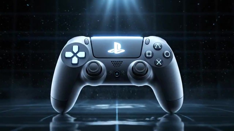 "action": "each piece enters frame like a precision missile, locking into place with sonic booms — thumbsticks spiral in, faceplate slams down with micro-explosions of light, final PlayStation logo burns in at the center — controller lands on glass surface, sending out shock ripples and lighting up its LEDs",