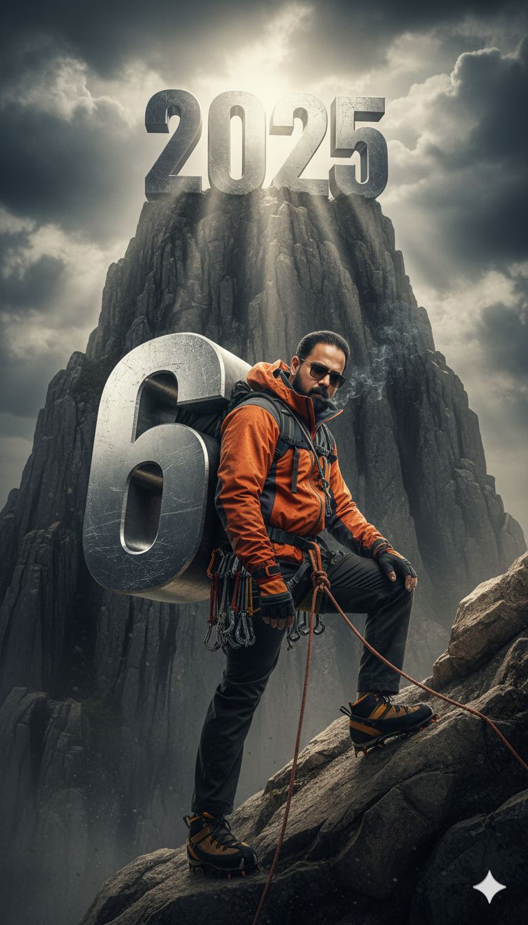 A man (face as per attached reference photo wearing sunglasses and a cap) dressed in the style of a professional mountaineer - outer jacket, harness, carabiner, gloves, climbing shoes - was climbing a very high and steep cliff. On his back was strapped a large number "6", made of heavy stainless steel, looking sturdy, reflective, full of fine scratches. At the top of the cliff, the number "2025" is firmly embedded in the rock, also made of large stainless steel, it looks monumental and heavy.