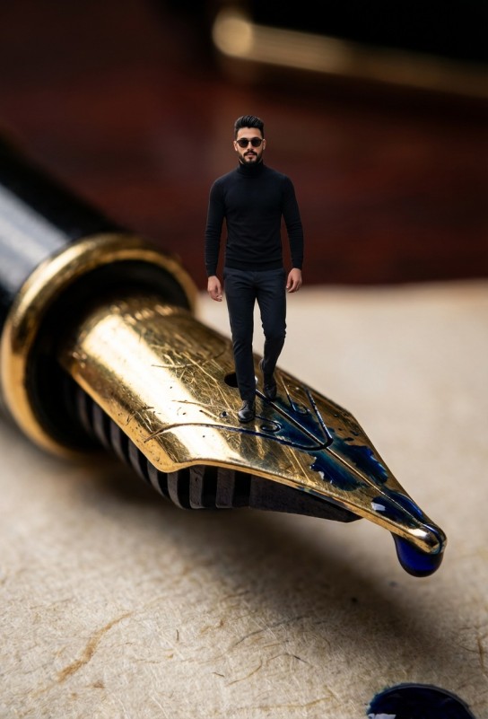 A hyper-realistic, surreal macro photography composition featuring a tiny, miniature man with uploaded face as reference standing boldly on the golden nib of a luxurious, antique fountain pen. The subject is balancing effortlessly on the split tip of the nib, wet with glistening dark blue ink, wearing a sharp black turtleneck, dark tailored trousers, and dark sunglasses. The image showcases extreme textural fidelity, highlighting the microscopic scratches on the gold metal, the fluid dynamics of the wet ink pooling in the feed, and the fibrous texture of the paper beneath. The lighting is dramatic and moody, emphasizing the metallic sheen of the gold and the liquid reflection of the ink, with a creamy, heavy bokeh background of a dark mahogany desk, evoking the style of high-end commercial macro videography and 8k Octane Render visual effects.