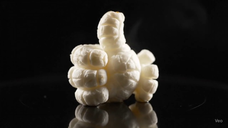 "Close-up cinematic shot of a single corn kernel placed on a hot black surface. The kernel begins to heat up, trembling slightly, then suddenly bursts open into fluffy white popcorn. Instead of forming a random shape, the popped corn takes the form of a hand showing a clear thumbs-up gesture . The texture is realistic, with steam and small fragments bursting outward. The background remains dark and dramatic, highlighting the transformation from golden corn to popcorn with the thumbs-up shape. Slow motion effect, crisp details, high contrast lighting."
