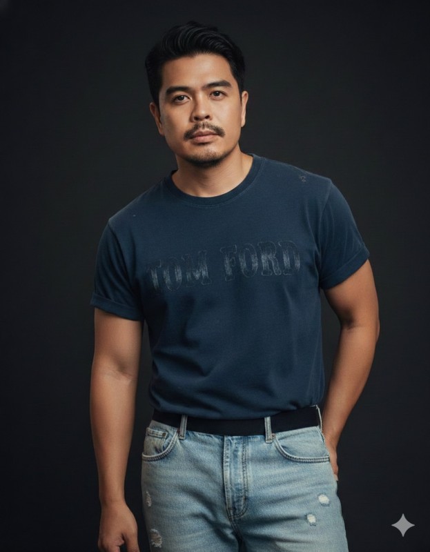 close-up, slightly angled shot of the Asian man from the reference photo, appearing in his early 30s with his natural facial features, including his mustache and soul patch. He has a slim build and dark, slightly tousled hair. He is wearing a dark blue, slightly distressed graphic T-shirt with rolled-up sleeves and a large stylized text design. His light blue distressed jeans show a black waistband with 'TOM FORD' text. His skin texture is natural and realistic, not overly smooth, reflecting a mature look. Plain dark background with soft lighting highlighting the outfit details. Cinematic and high-detail.", "aspect_ratio": "3:4"