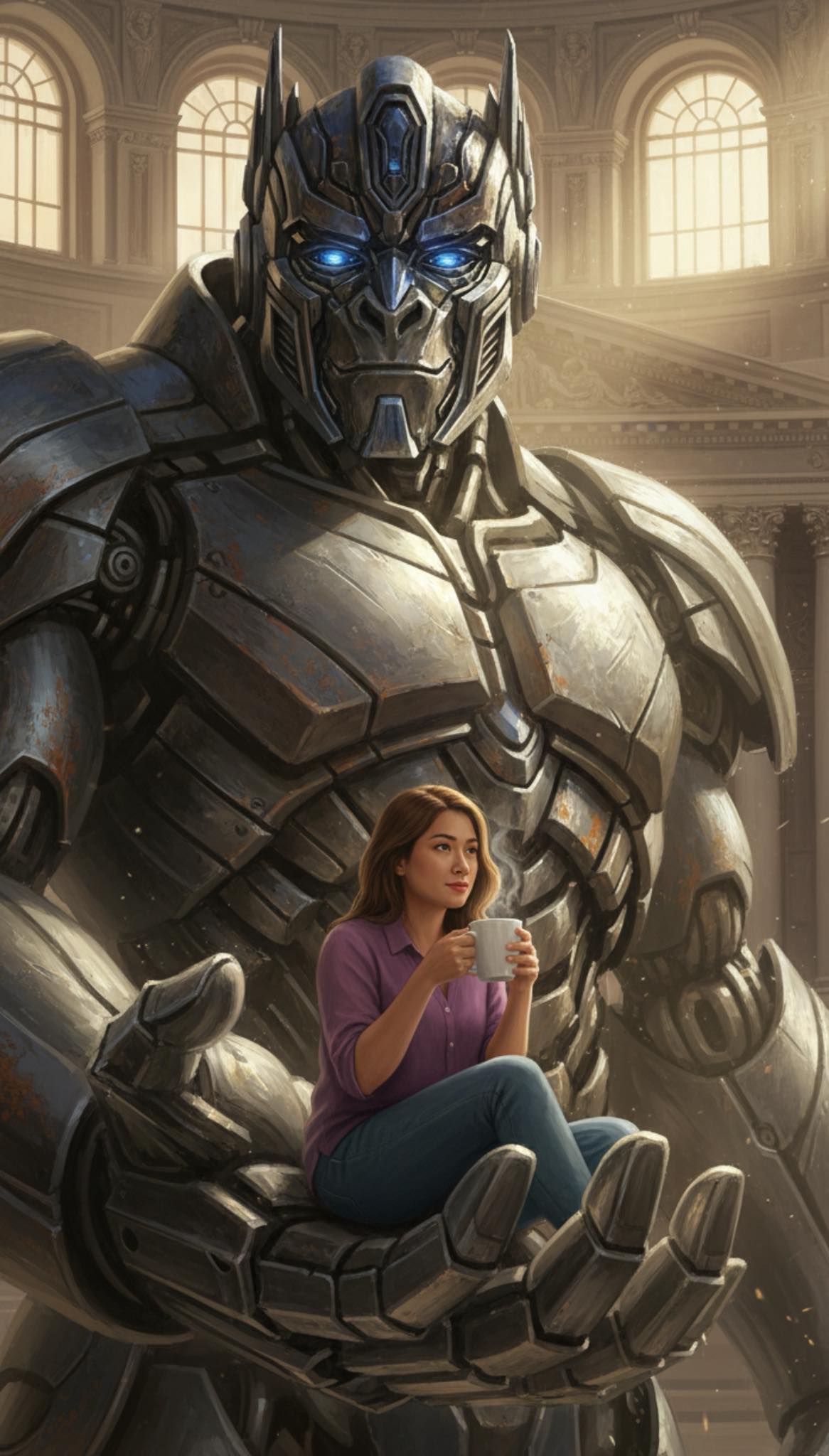 Ultra-realistic fantasy artwork of a woman (use the photo) casually drinking coffee while sitting on the giant metallic hand of Optimus Primal from Transformers. Optimus Primal is shown in half-body form, towering in size, with a mix of mechanical and gorilla-like features, detailed armor, and glowing blue optics. The woman is relaxed, holding a steaming cup of coffee, dressed in casual modern clothes (purple blouse wearing jeans) The perspective emphasizes the contrast in scale between the huge robotic hand and the small human. Background is opera house with soft morning light filtering through, adding an epic yet calm atmosphere."