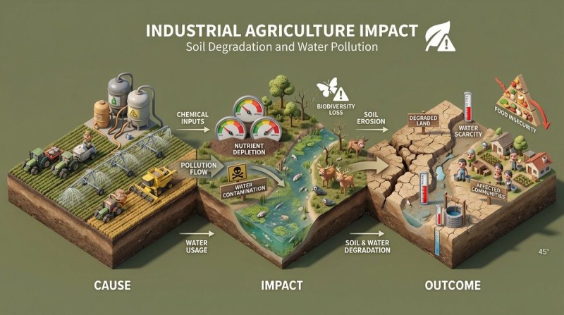 Textures look realistic and balanced. Lighting feels soft and clear. The raised base splits into cause, impact, and outcome sections. Include visual indicators like meters, symbols, or levels.