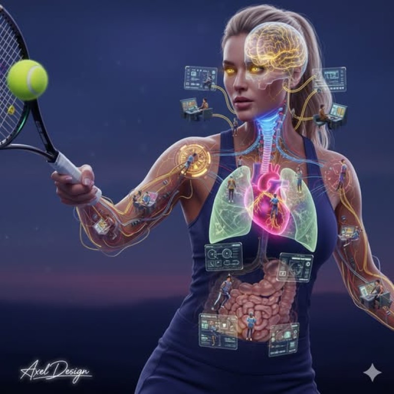 The image of the tennis player should allow a view inside her body. Inside, humanoid-like beings can be seen controlling each function from within, providing the strength and precision needed to hit the ball.