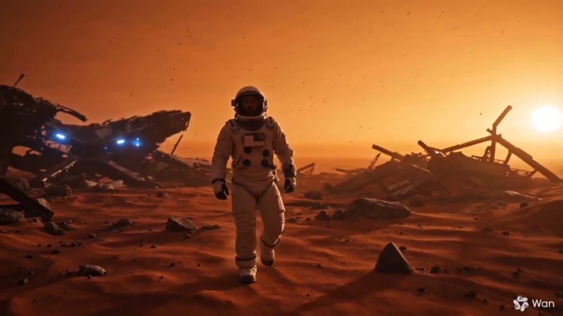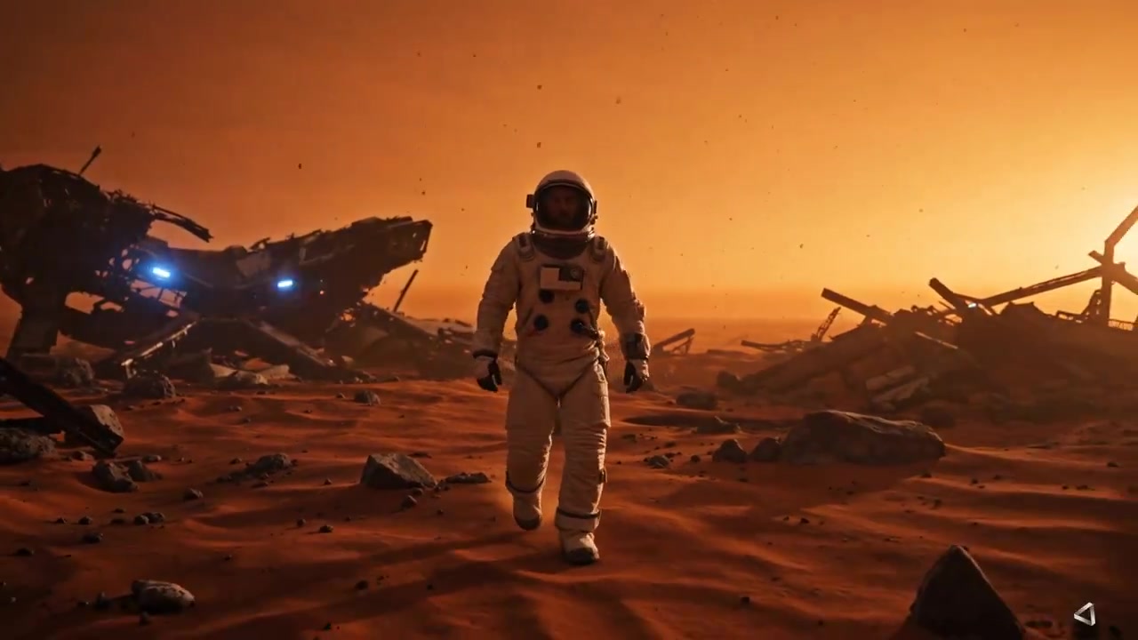 A weary astronaut in a tattered white EVA suit with a cracked helmet visor walks alone through the desolate remains of a crashed space station on a barren red planet, debris scattered across the dusty ground. The camera follows with a slow handheld lens as he limps forward, glancing around cautiously. A soft side light from the setting alien sun casts elongated shadows, while flickers of blue emergency lights intermittently flash from the ruins behind him. Shot in a wide-angle lens with center composition, the atmosphere feels tense and isolating. The scene is stylized in a gritty sci-fi realism aesthetic, with dusty particles floating in the air and faint radio static as background audio.