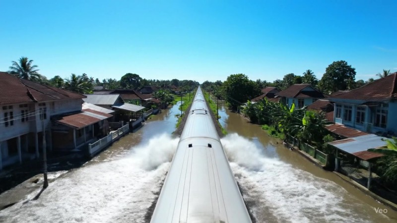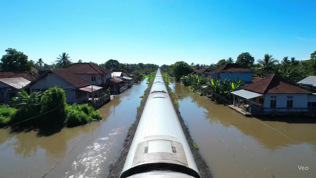 Cinematic aerial footage of a long white train speeding along a single track submerged on a brownish rural road surrounded by typical Indonesian housing. The train cuts through the water, creating white foam and waves. The camera pans from behind, slowly descending and following the train forward. Bright natural light, clear skies, sparkling reflections of the water, and the glistening surface of the train. The roaring sound of the engine, the rhythmic creaking of the wheels, and the splashing of the water.