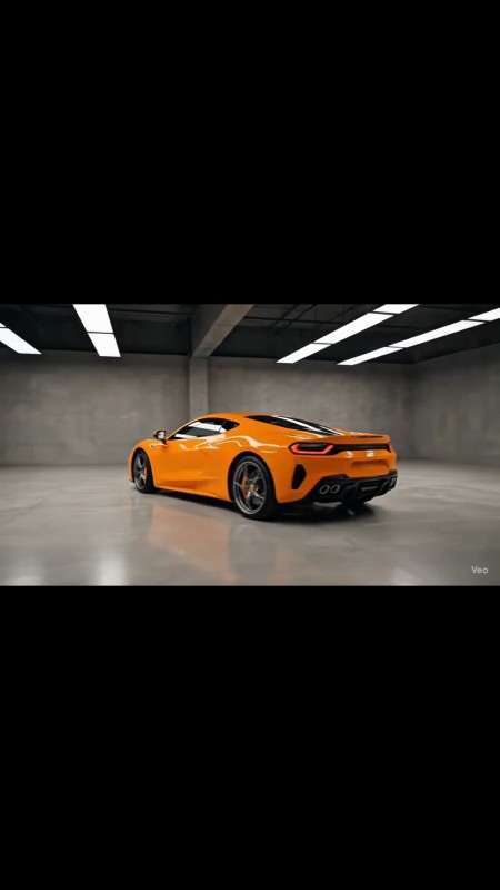 Ultra-realistic video of a sleek orange sports car parked motionless at the exact center of a vast, empty indoor garage. The garage has smooth, matte grey concrete walls and a polished floor reflecting soft light from bright overhead fixtures. The space is clean, minimalistic, and expansive, with no clutter. The camera performs a fast-paced orbit around the car, using speed ramping for dynamic acceleration and deceleration, circling the vehicle from all sides while keeping it perfectly