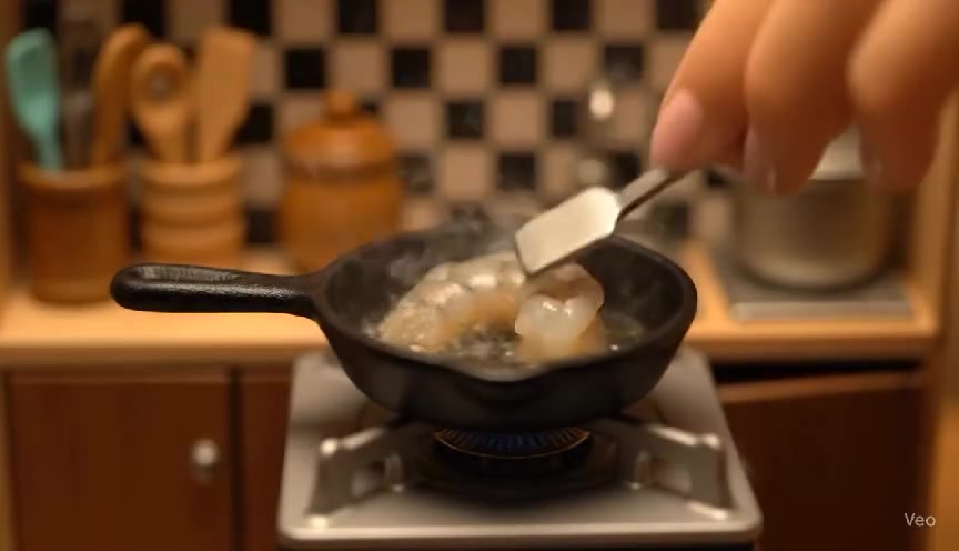 A hyper-realistic close-up of a tiny, cast-iron frying pan sizzling on a miniature gas burner inside a doll-sized kitchen. Delicate human fingers carefully place a single, deveined shrimp into the pan. The shrimp slowly curls into a bright pink ‘C’ shape as it cooks. Captured in slow motion, gentle steam rises, and oil bubbles shimmer under warm, golden morning light. The shallow depth of field highlights the shrimp’s glossy texture and the pan’s matte surface. Soft shadows fall on the dollhouse kitchen backdrop, giving the scene an almost magical, surreal feel — a blend of handcrafted fantasy and high-end culinary realism.”