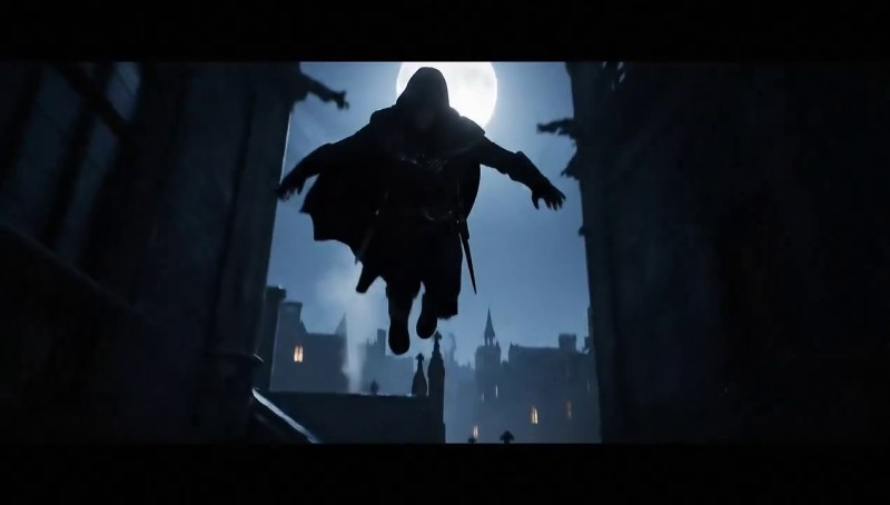 "composition": "Begins with an overhead top-down shot following the hooded assassin sprinting across slanted rooftops. Then cuts to a low-angle shot as they leap between buildings.",